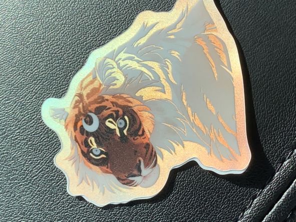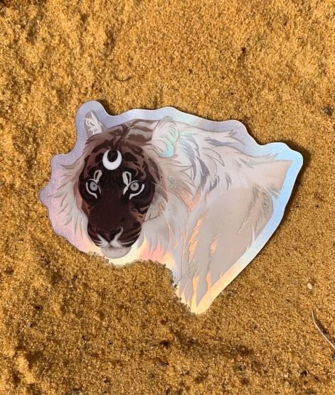 Die-cut holographic sticker of my tiger design <3 This is approximately 3"x3" Waterproof, dishwasher safe, sturdy vinyl