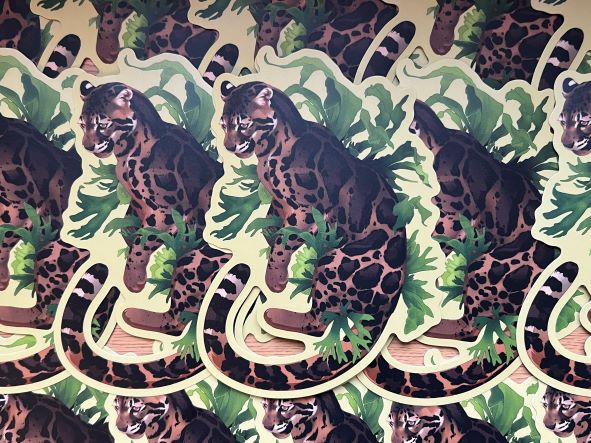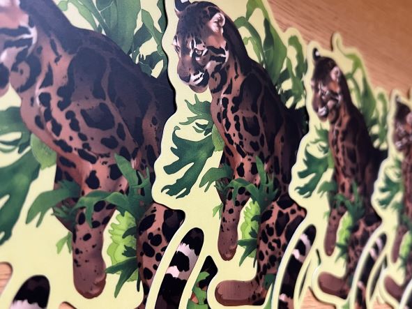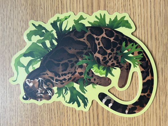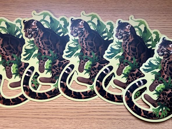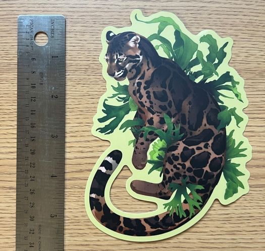 -die-cut, matte vinyl sticker of a clouded leopard with staghorn ferns