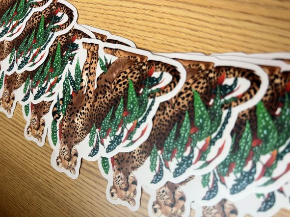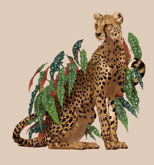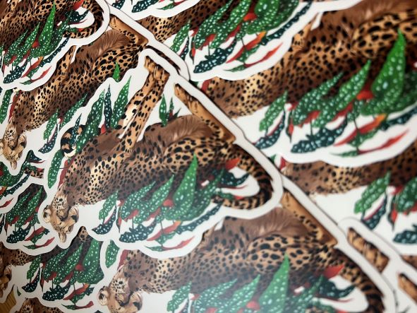 -3.92"x4.08" -die-cut, matte vinyl sticker of a king cheetah with begonia maculatas