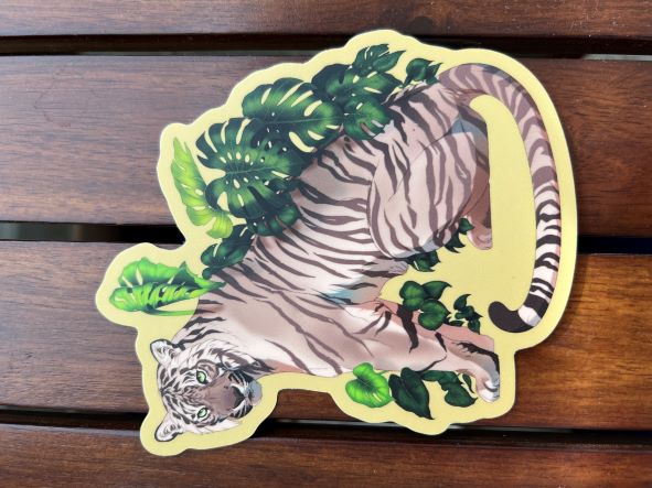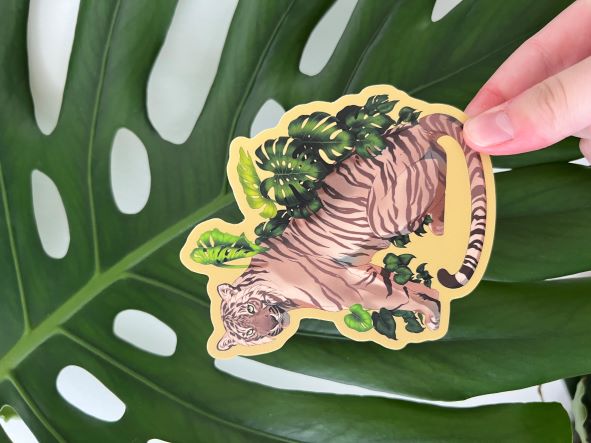 Vinyl, matte die-cut sticker that is waterproof and dishwasher safe! The sticker measures 3.75" x 4.29"