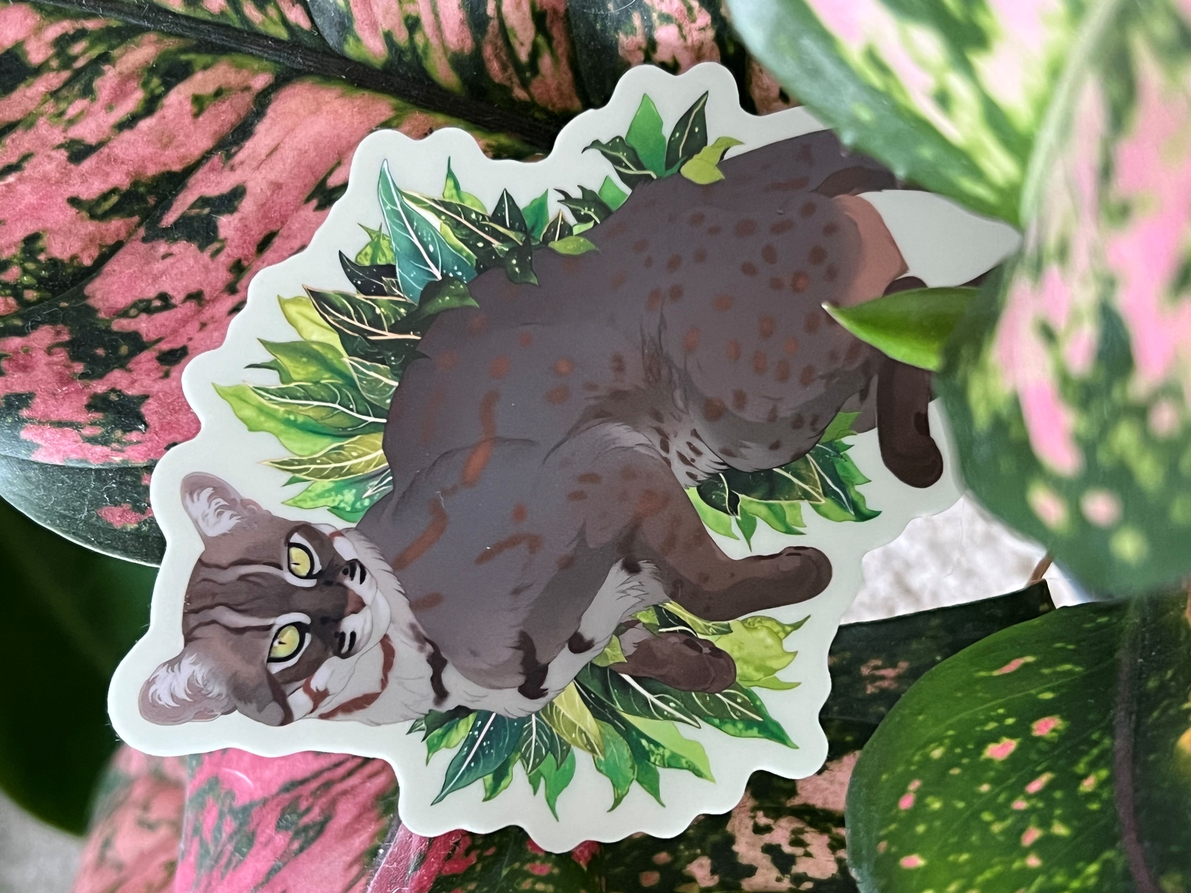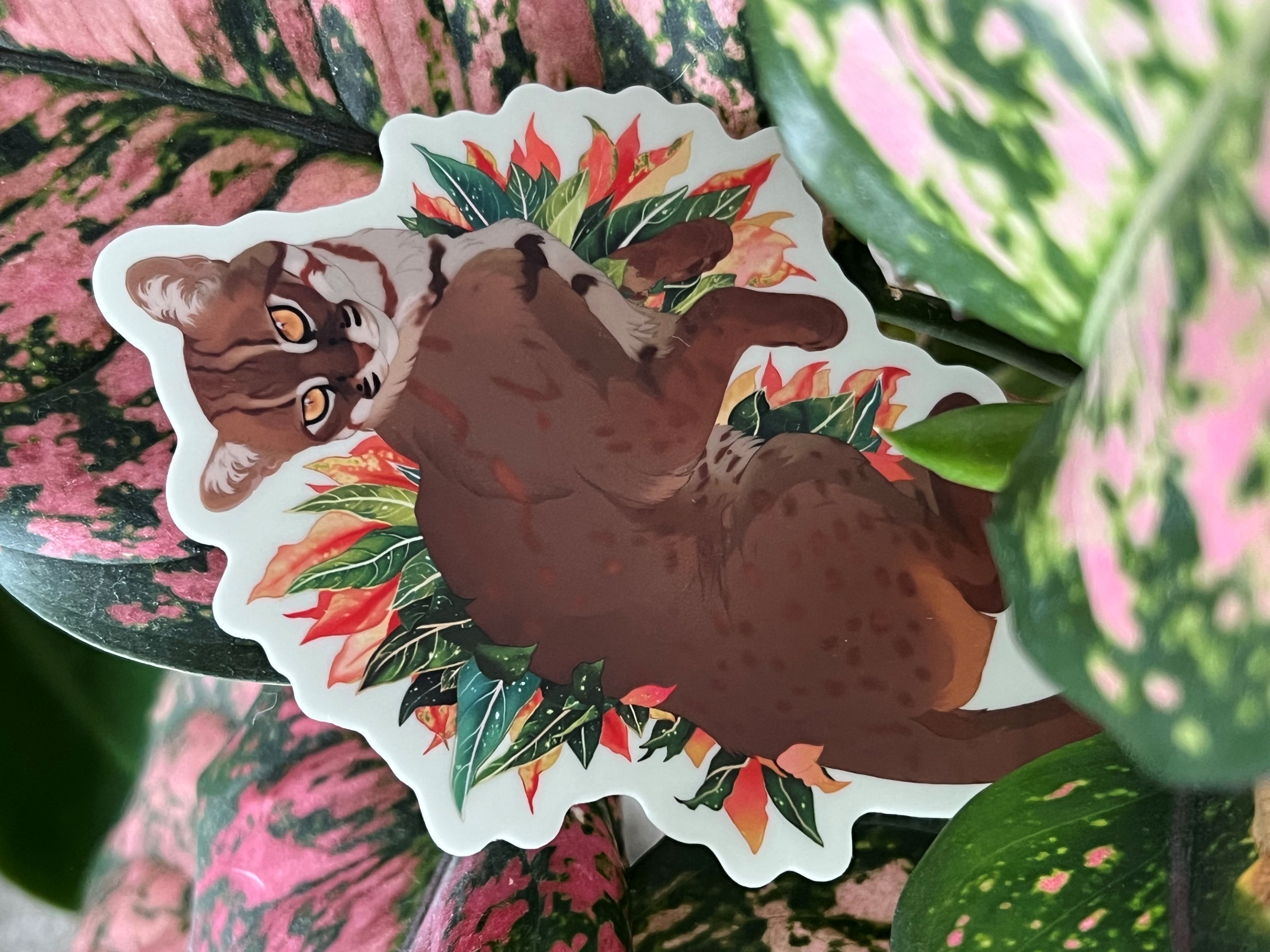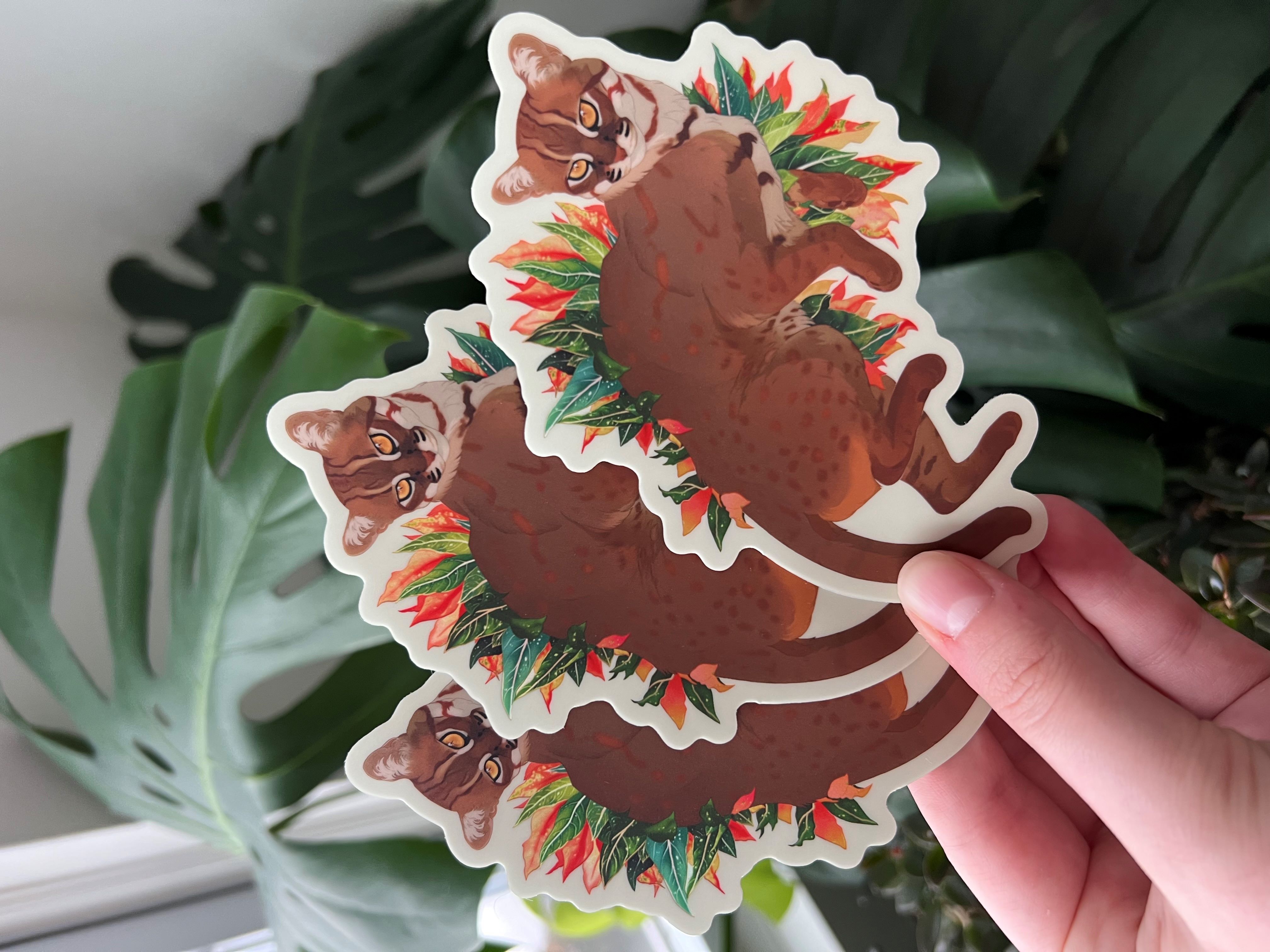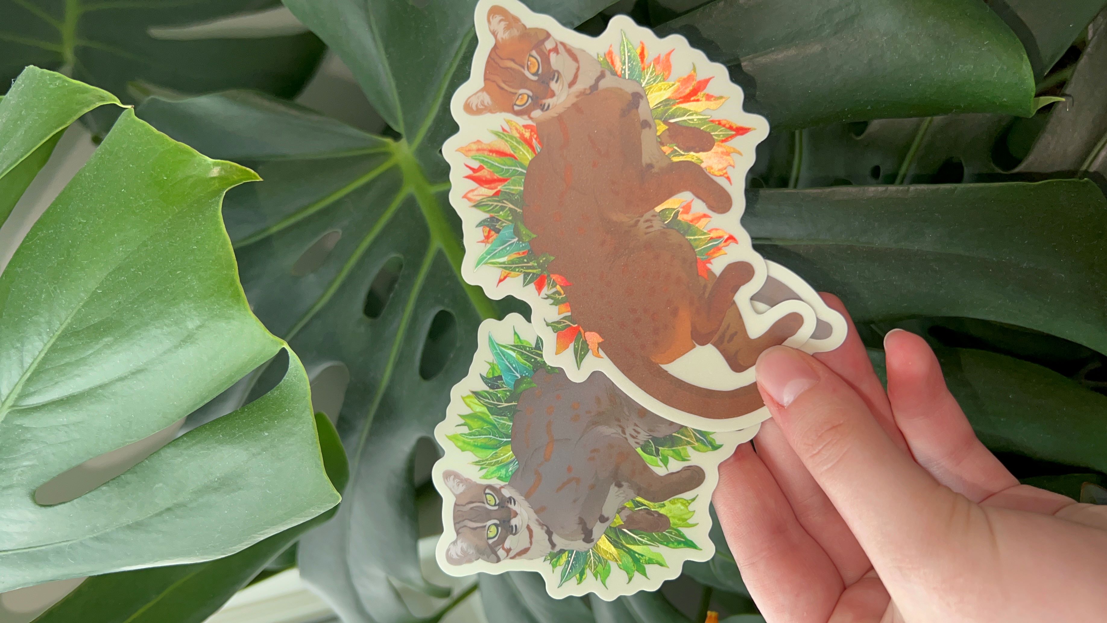 Approx. 4"x4" vinyl sticker with a holo effect on the leaves and eyes. This sticker is waterproof and dishwasher safe.