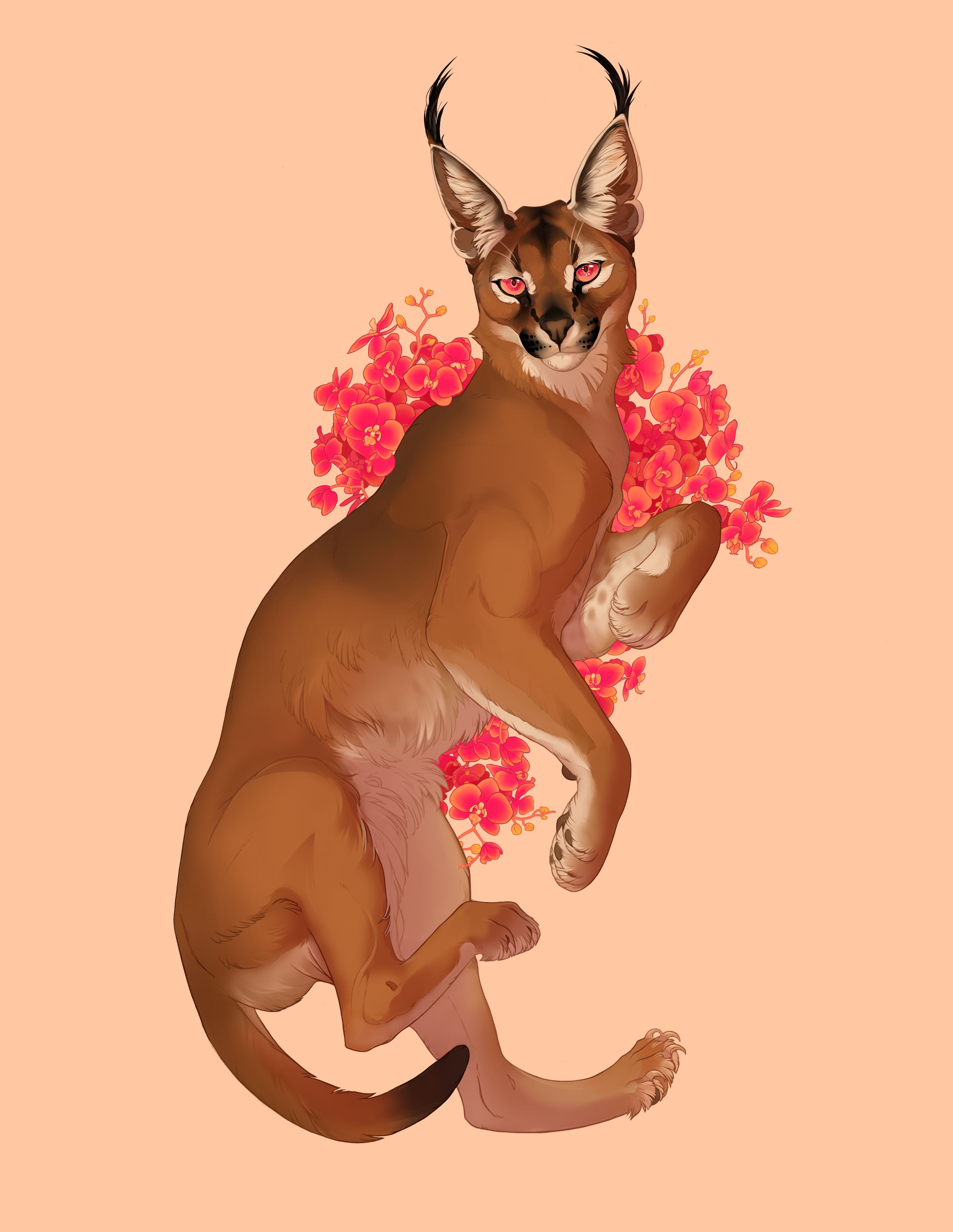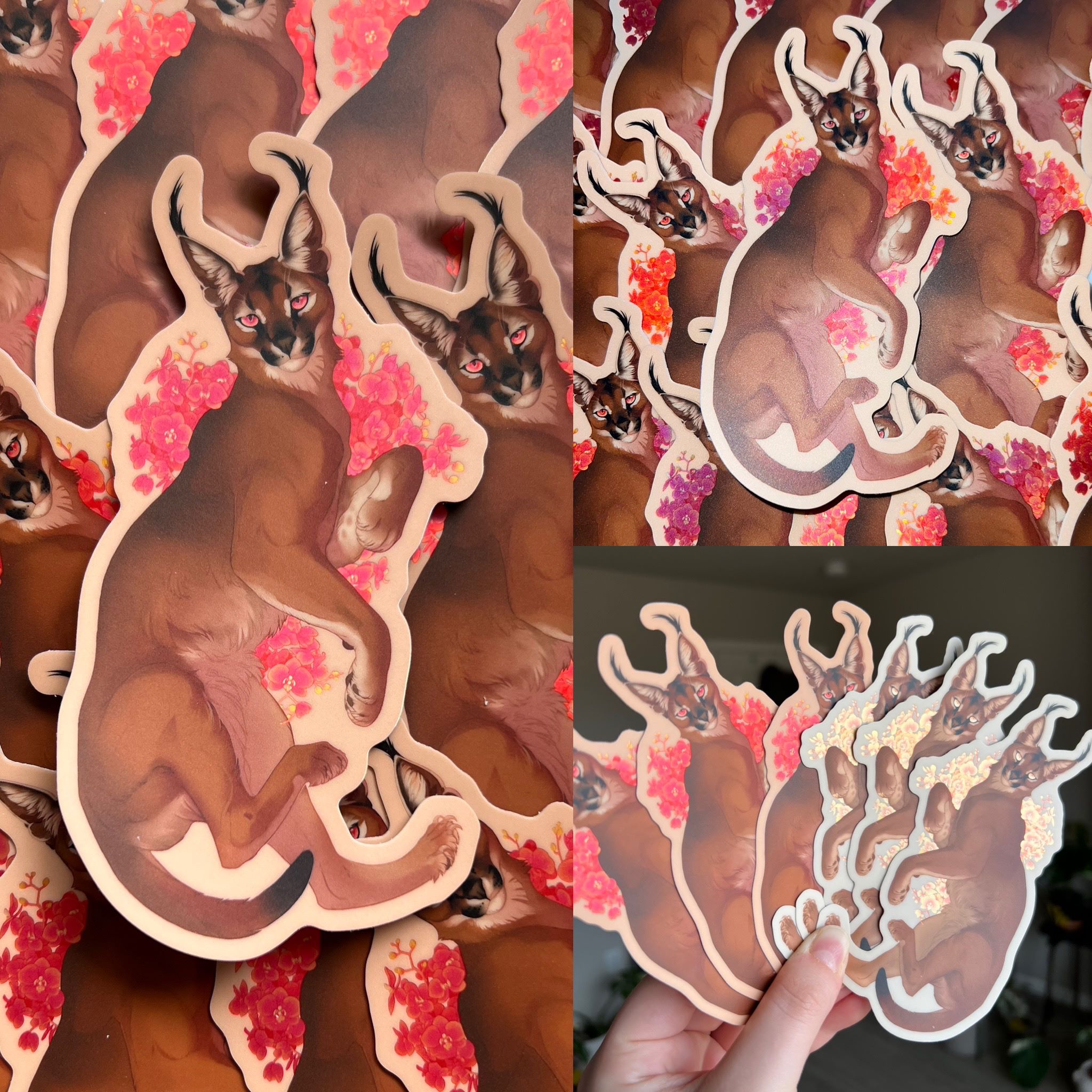 Vinyl sticker with a slight holo effect on the caracal's eyes and the orchids. This sticker is 3.05" by 5.24", and they are waterproof and dishwasher safe!